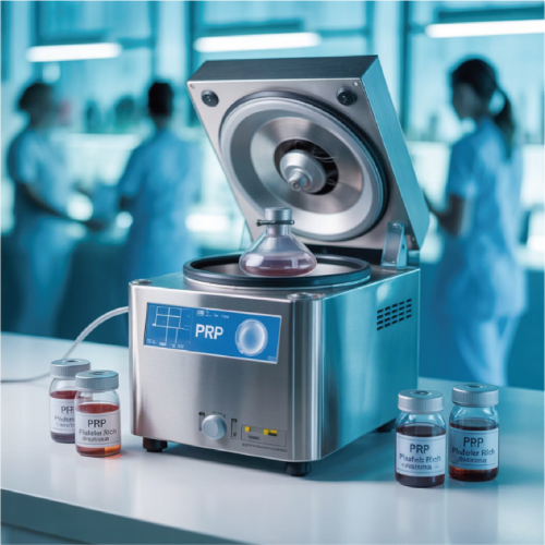 遠心分離機を用いて血液から多血小板血漿(PRP)を抽出します。